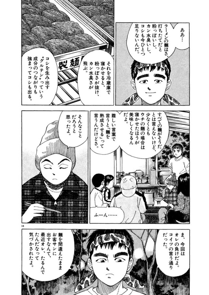 すべての麺がそうだとは言えないけど、少なくともウチの麺の場合は寝かせたほうが美味しくなるんだよ。 難しい言葉で言うと「麺を熟成させる」って言うんだけどさ。(画像引用元:ラーメン発見伝(1) [ 久部緑郎 ] p89)